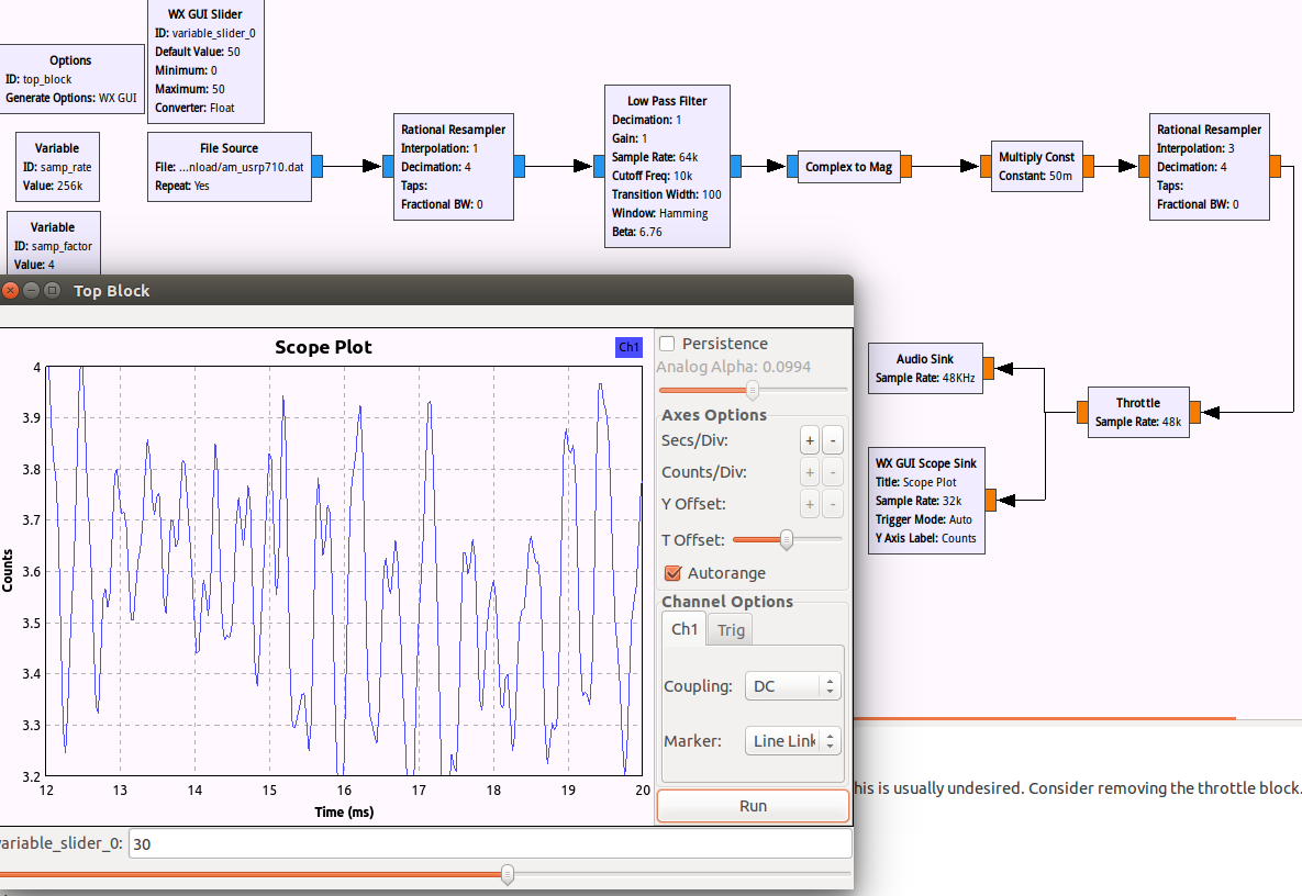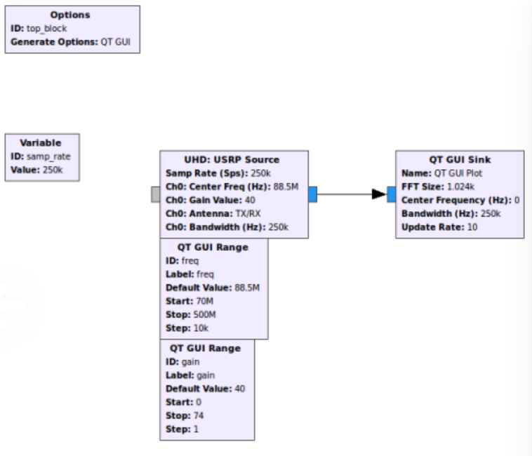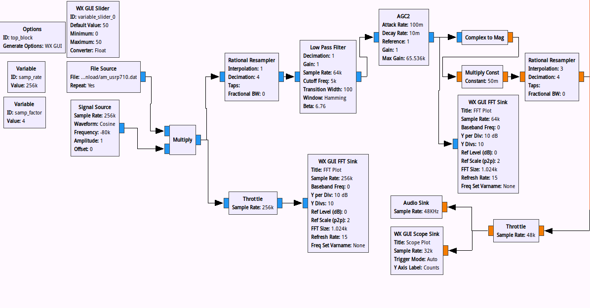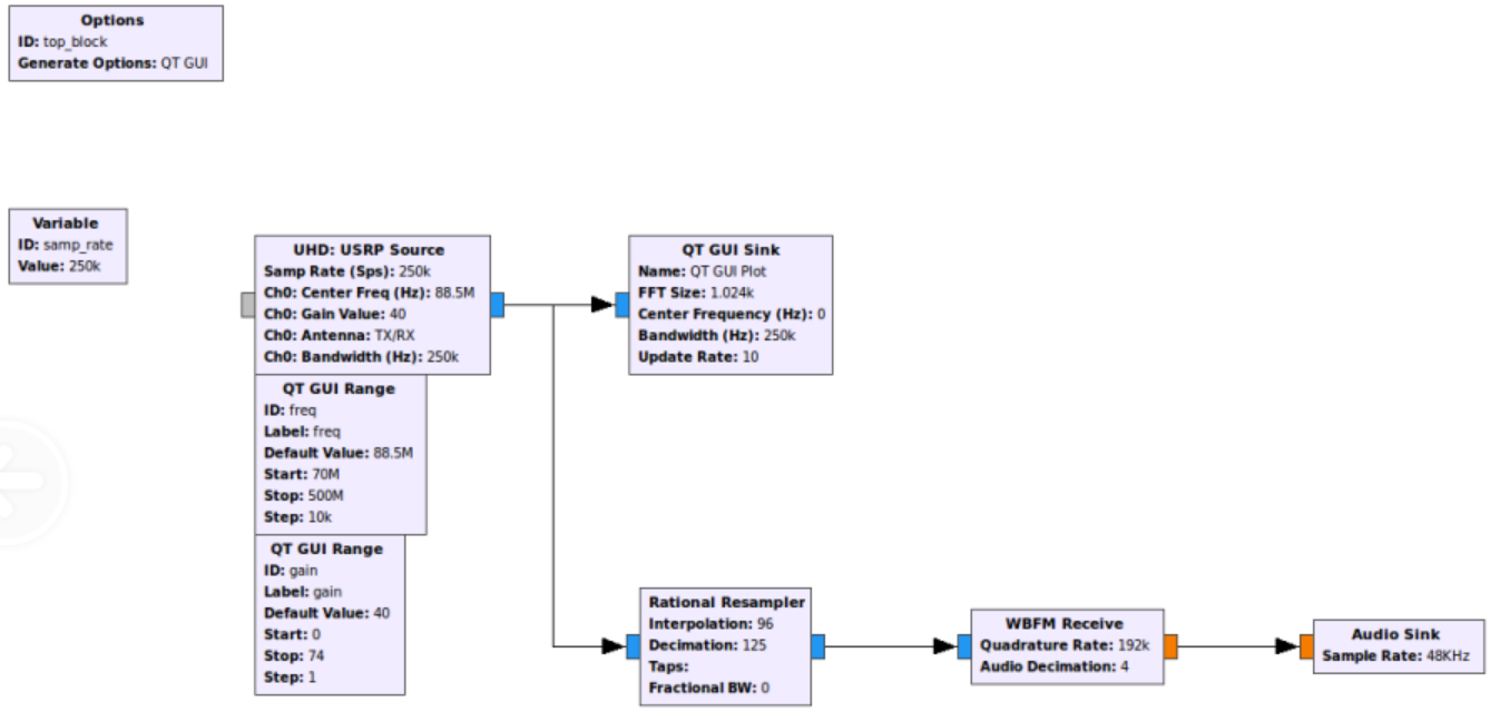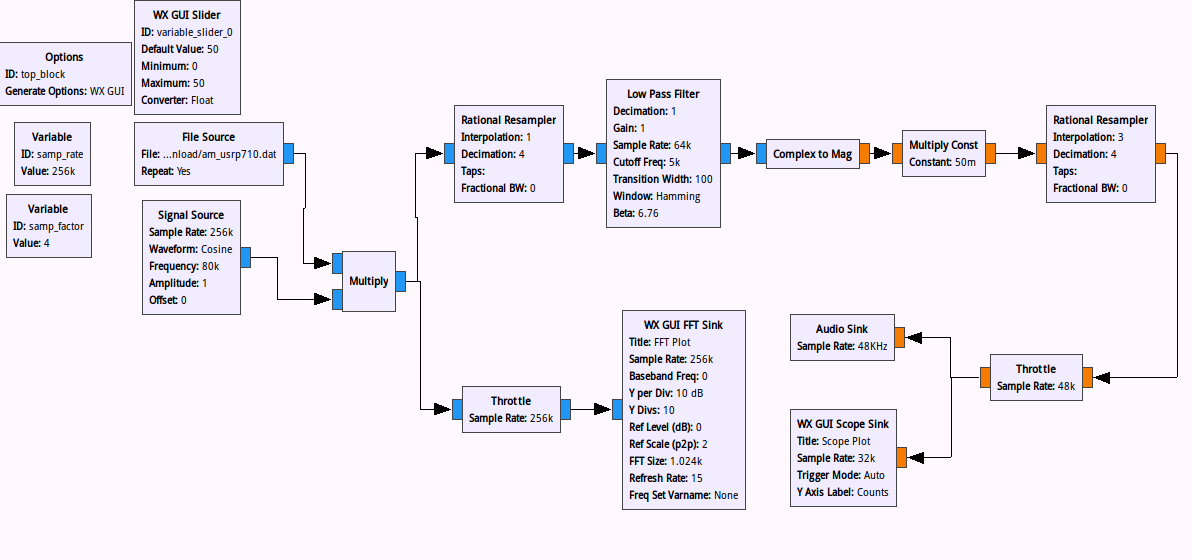 - 使用一个 Variable 模块和“Rational Resampler”模块