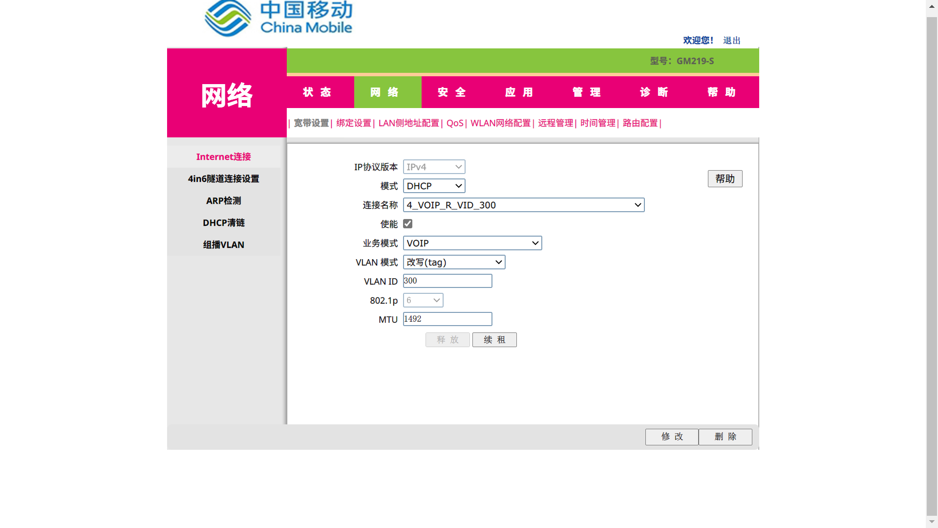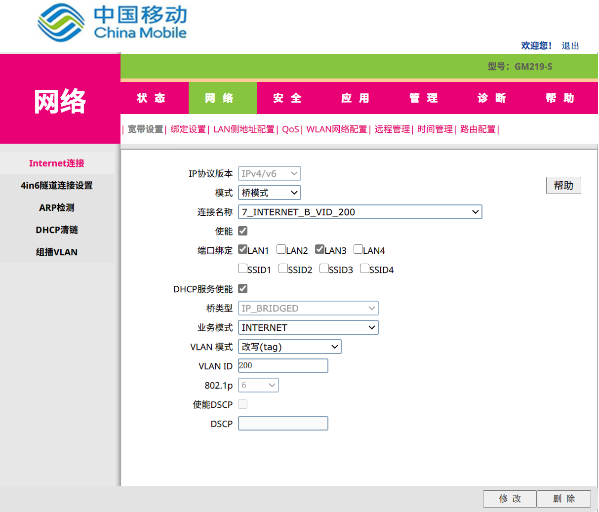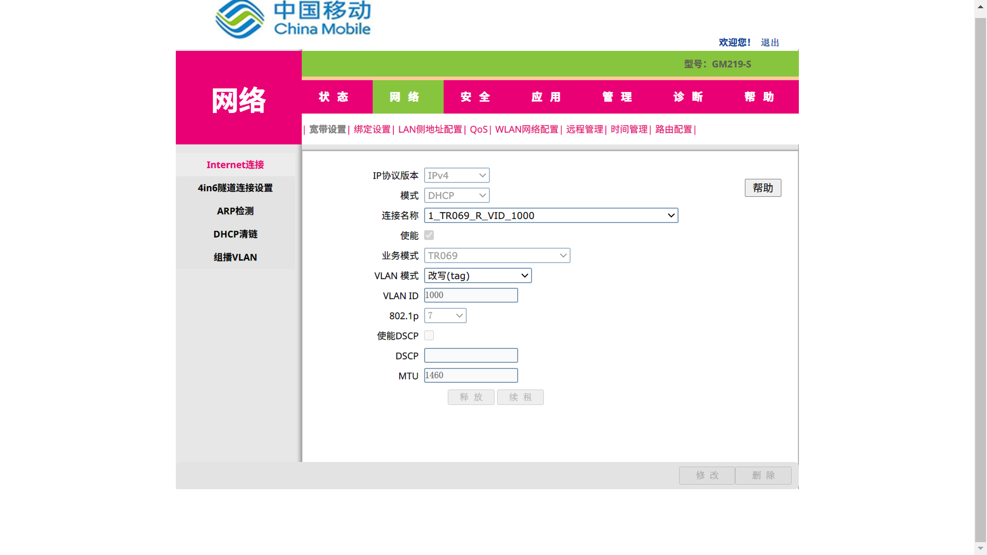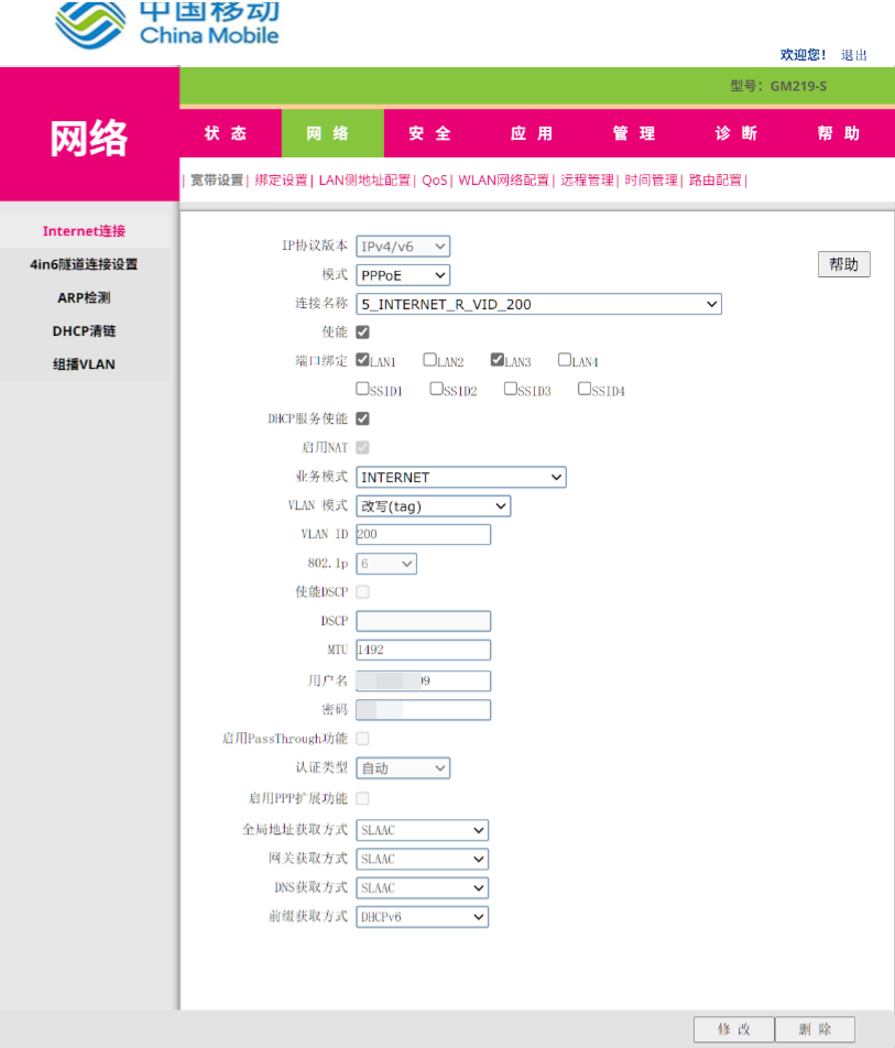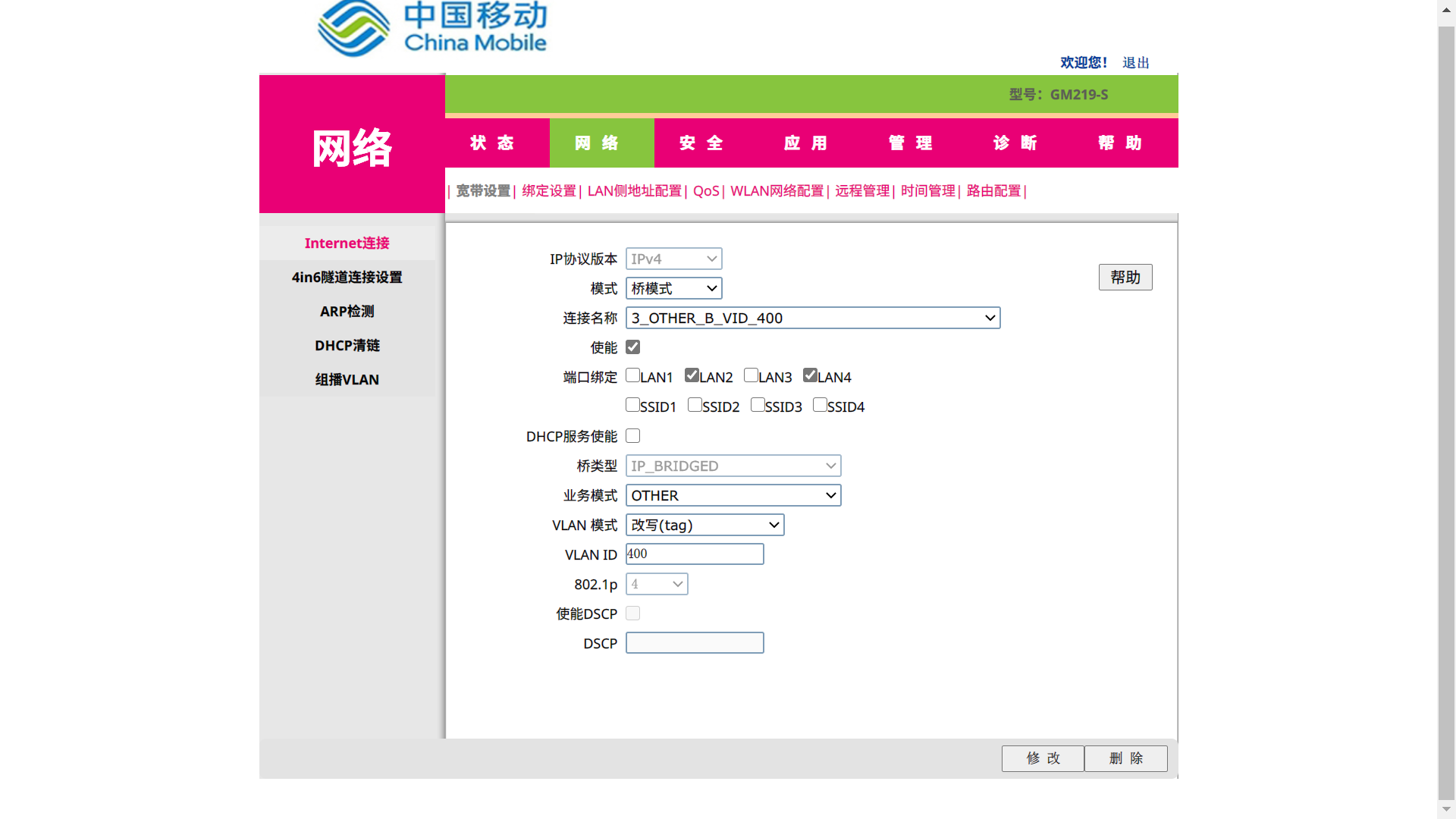 此处应向移动咨询,对于不同的业务(如INTERNET和OTHER对应于不同的VLAN ID),填错可能不能正常使用,也推荐自己记住自己家的这些ID。