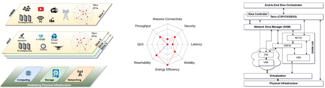 The heterogeneity(异质性) of network services coexisting(共存) in the same infrastructure requires networks to be designed to achieve a multitude of requirements that can be conflicting. Furthermore, such services are very dynamic and subject to unpredictable demands. Additionally, it is expected that networks will reach a much bigger scale in the coming years, mostly driven by the growth of the Internet of Things (IoT). This shift in scale will raise the network demands drastically, including 1000 times more data volume, from 10 to 100 times more devices, 5 times lower latency, and high bit rates per user. These new demands will require higher spectrum efficiency, better coverage, supporting an increasing number of heterogeneous devices, while being cost-effective(成本效益)[1]. To support this, the concept of Network Slicing arises, allowing network operators to split their physical infrastructure into multiple logical networks, each one orchestrated(被安排) according to its specific characteristics. As depicted in Fig. 1a, each slice represents an independent end-to-end network and can be owned by distinct tenants(租户) (or vertical markets(网络销售)) that control physical, virtualized, and service layers, with distinct Key Performance Indicators (KPIs). Examples of KPIs are Latency, Data Security, Energy Efficiency, Mobility, Massive Connectivity(大规模连接), Reachability, Quality of Service (QoS), and Throughput(吞吐量), as illustrated in Fig. 1b.
